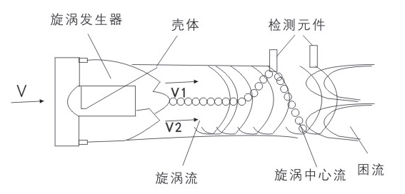 当流体通过由螺旋形叶片组成的旋涡发生器(见图1)后.流体被迫绕着发生体轴剧烈旋转,形成旋涡。当流体进入扩散段时,旋涡流受到回流的作用,开始作二次旋转,形成陀螺式的涡流进动现象。该进动频率与流量大小成正比,不受流体物理性质和密度的影响。检测元件测得流体二次旋转进动频率,就知道了流量。而且能在较宽的流量范围内获得良好的线性度。流量计算式为: